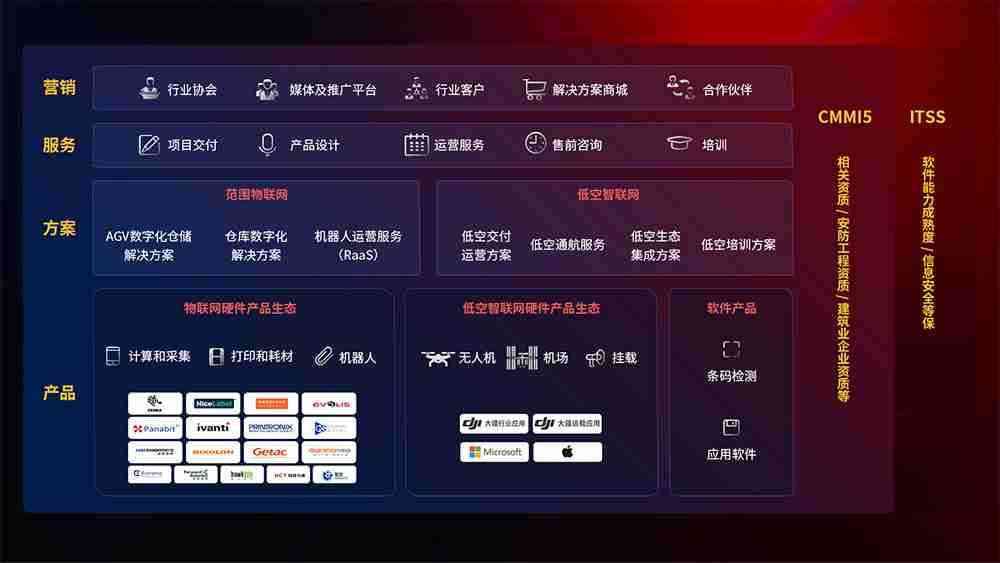 聚合国内外先进的物联网硬件产品品牌,,聚焦数字化仓储、、、、机器人运营、、、、低空智联网等领域,,,,共同打造适合客户业务场景的解决方案并提供交付服务